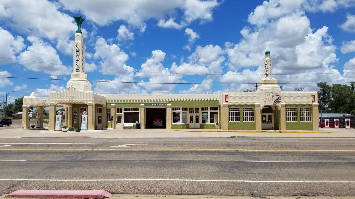The iconic U-Drop-Inn restaurant and Conoco station in Shamrock, Texas. Now preserved and restored.
